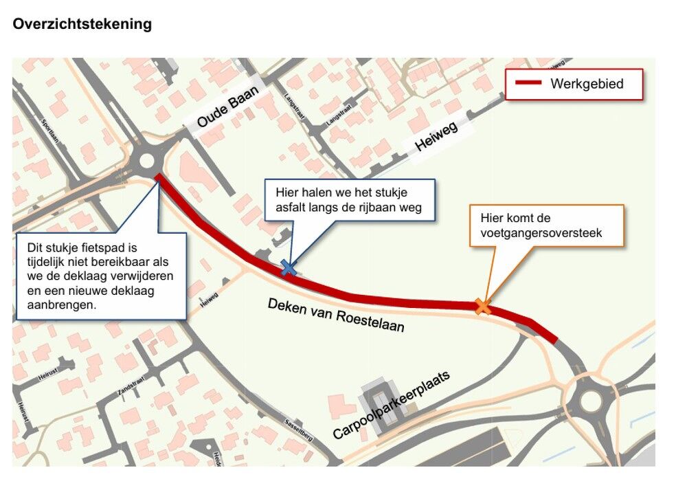 Op vrijdag 31 oktober 2025 vinden er een aantal werkzaamheden plaats aan een deel van de Deken van Roestellaan . De werkzaamheden duren tot en met zaterdag 8 november.